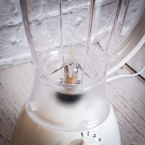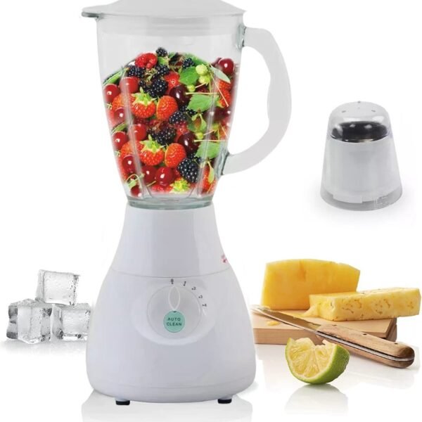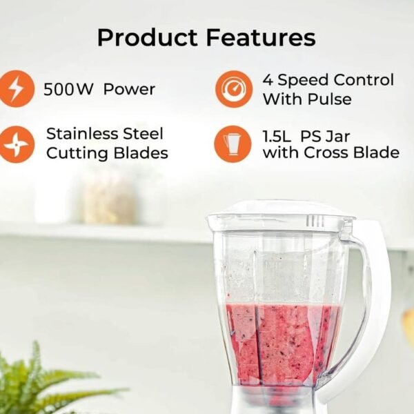 A kitchen blender with stainless steel blades and 500W power to crush ice, fruits and vegetables in seconds, so you can easily blend ingredients into a smooth mix.