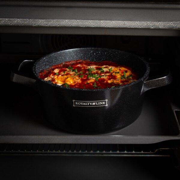 Royalty Line induction cookware set has a 3-layer non-stick coating, which keeps it 100% free from exposure to harmful substances. And it is heavy and sturdy, for long-term use. The pan set has cool-touch ergonomic and heat-resistant handles that ensure comfortable and safe cooking.