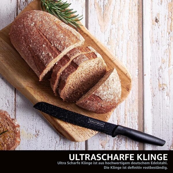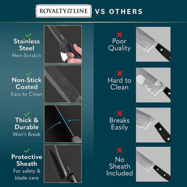 The knives boast superior non-stick properties, ensuring a seamless and effortless slicing experience. Combining practicality with style, the Royalty Line knife set stands as a versatile addition to any kitchen. The non-stick coating and high-quality stainless steel inner layer simplify cleaning – just rinse with water and dry after use. Its elegant black hue adds a touch of sophistication to your kitchen decor, while the compact design ensures easy storage.