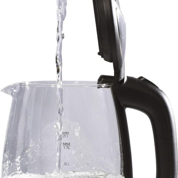 The 1.7 liter glass carafe is BPA-free on the inside. The carafe has measuring marks on the side, so you can quickly read exactly how much water you need.