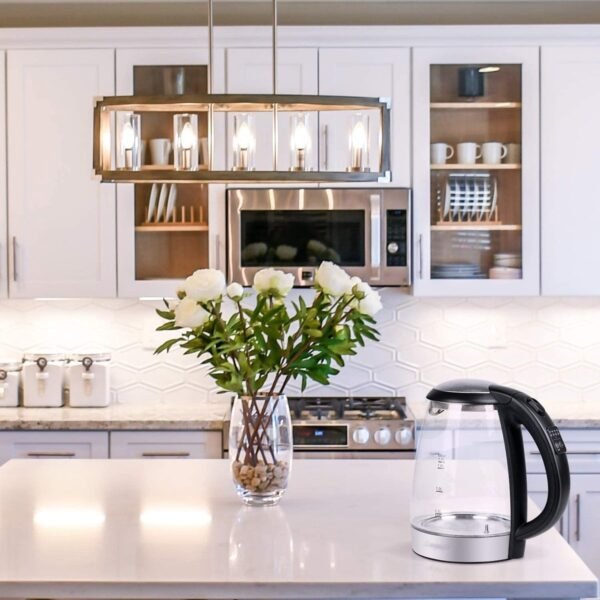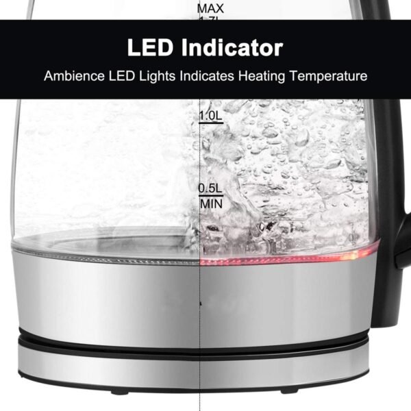 This glass kettle looks great on the countertop. Red LED lights on the kettle light up when water is heated for a soft blue glow.