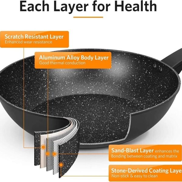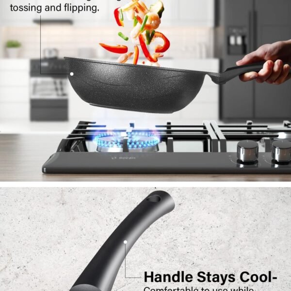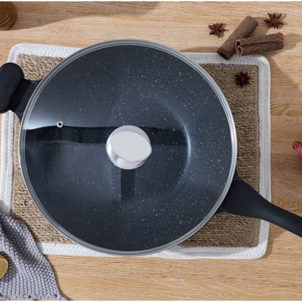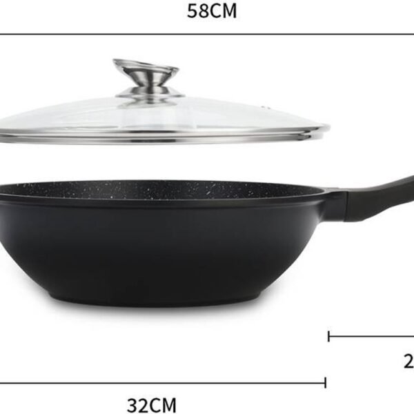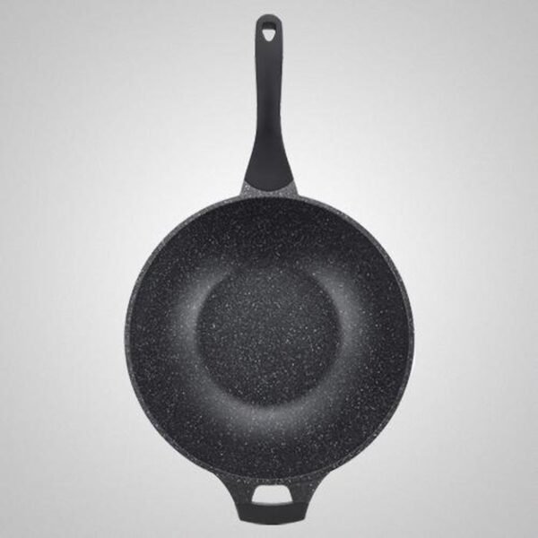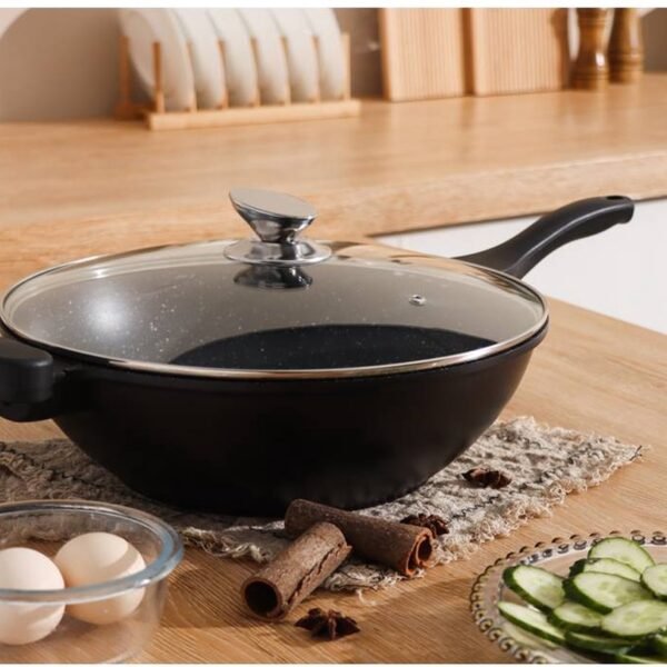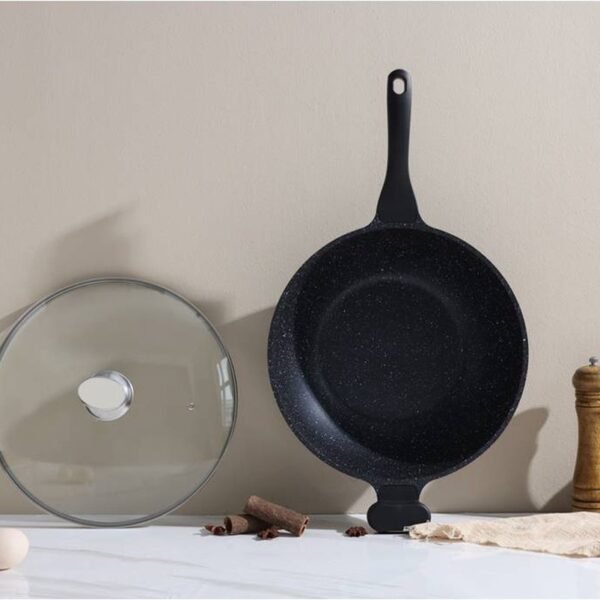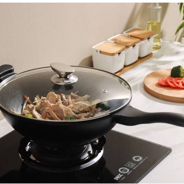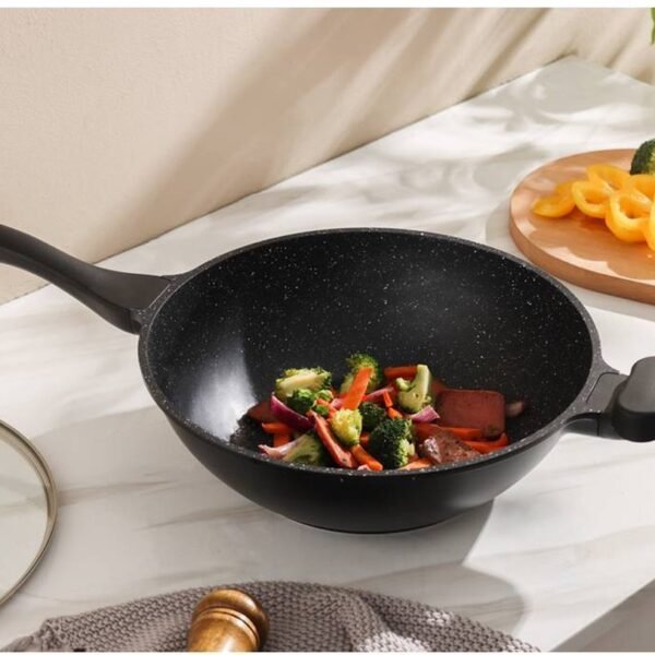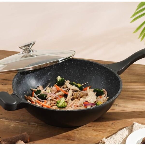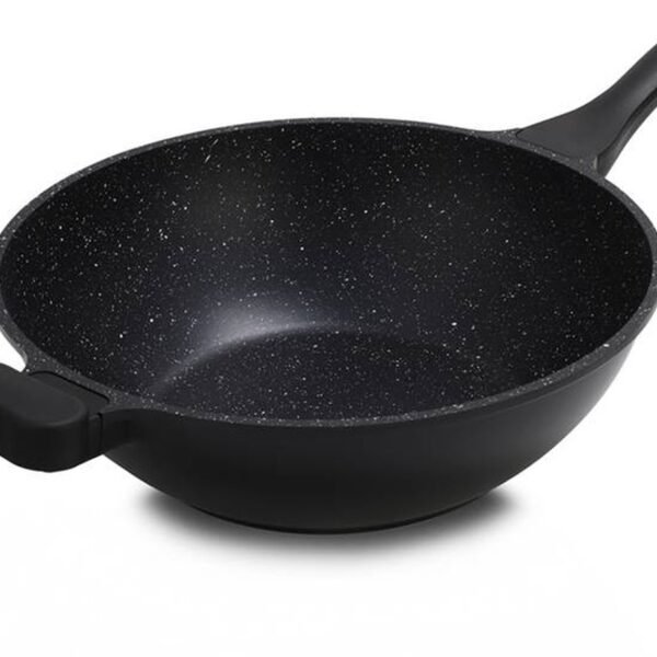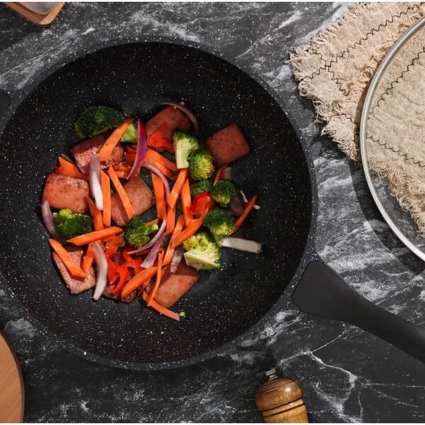 This 28cm non-stick wok pan is made from a forged aluminum alloy that conducts heat quickly and evenly with precise temperature control. Food heats quickly and evenly on this skillet and slides onto the plate once it’s ready. In addition, this frying pan can be used on stoves such as gas, induction, electric, ceramic and glass.