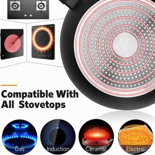 Royalty Line Nonstick wok pan uses stone-derived ceramic Titanium coating, which is free of APEO or PFOA! With the smooth interior and flat bottom, this frying pan can be used on all types of stoves and is ideal for frying eggs, steak, fillet, etc. Perfect for home or restaurant use! A perfect gift for your friends and family!